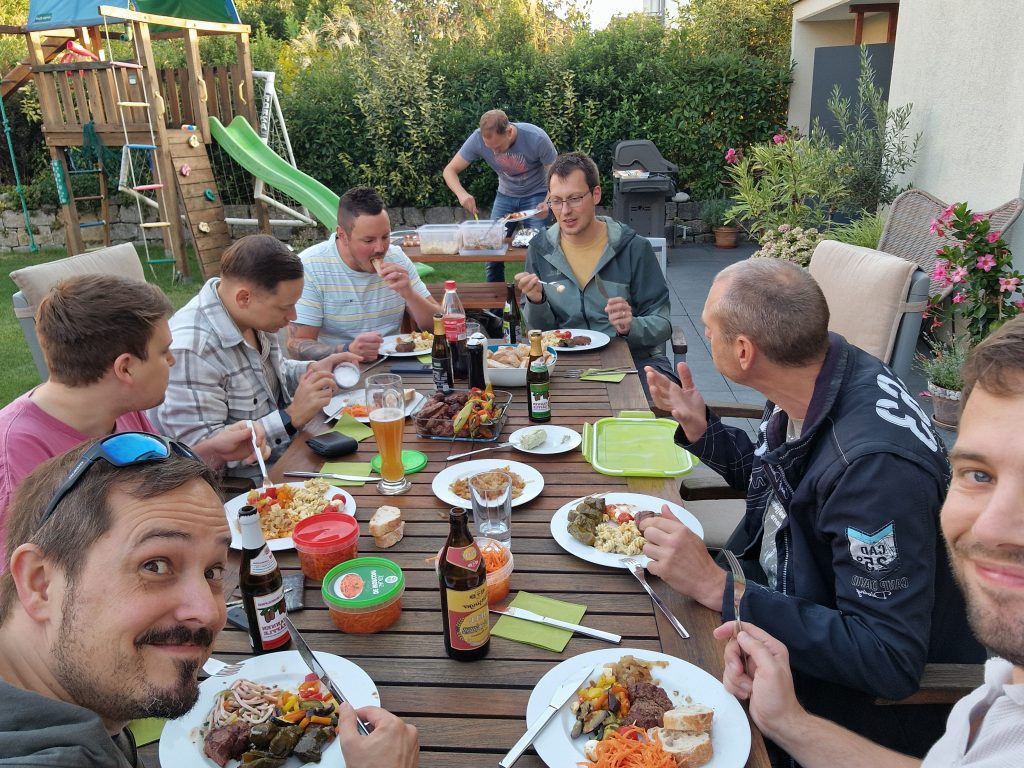 Die Sommerpause ist vorbei, die Ball fliegt wieder durch die Alte Turnhalle. Doch auch in den vergangenen Wochen gab es das ein oder andere Highlight. So gab es das Sommerfest mit Jubiläumscharakter, die dritte und vierte Mannschaft spielten Freundschaftspiele und die erste und zweiten Mannschaft vergnügten sich abseits der Tischtennisplatte beim jährlichen Teamgrillen. Schon in den vergangenen Sommerpause lud Mannschaftsführer Christian Förster die damals noch komplett erste Mannschaft zu sich nach Hause ein – plus „Ersatzspieler“. Auch diesen Sommer wurde die Tradition nicht gebrochen, sondern aufgrund der neuen Mannschaftskonstellation eher erweitert. Zur ersten Mannschaft kamen einige der zweiten Mannschaft sowie der gern gesehen Trainingsgast und TTV-Freund Holger Weidenauer dazu. Es entwickelte sich ein gemütlicher Abend, an dem es nicht nur um Tischtennis ging, sondern auch um verschiedene andere Themen. Jeder brachte Salate oder Beilagen mit, Christian Förster sorgte mit seiner Grill-Expertise für feines Steak von Rind und Lamm. Bier und andere Kaltgetränke rundeten das „Festmahl“ ab. Am späten Abend endete dann der muntere Abend. Die letzten Verbliebenen zog es noch in den Keller, wo Tim Trobisch am Schlagzeug ein kleines Solo zum besten gab. Anschließend mussten sich Holger Weidenauer und Tobias Becker im Tischkicker noch Christian Förster und Tim Trobisch geschlagen geben. Dann war der gelungene Grillabend für diesen Sommer vorbei. Teamgeist und Zusammenhalt wurden gestärkt, die neue Saison kann beginnen…